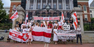Belarusians of Boston gathered at the statue of Tadeusz Kościuszko to mark a year of the Belarusian fight for freedom, democracy, and human rights